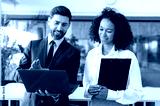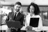 Positive friendly coworkers, a dark-skinned pretty woman and influential caucasian man, are standing in a modern office, viewing a report on a laptop, develop business plan and strategy, smiling