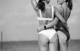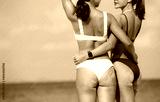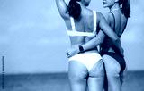 Close-up of hips. Two sexy beautiful woman in bikini at sea coast with copy space. Tanned body in a swimsuit