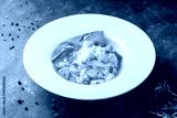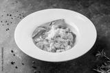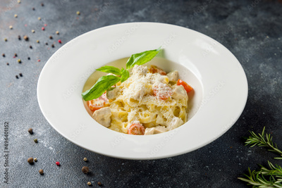 Pasta with chicken and tomatoes on creamy sauce with parmesan