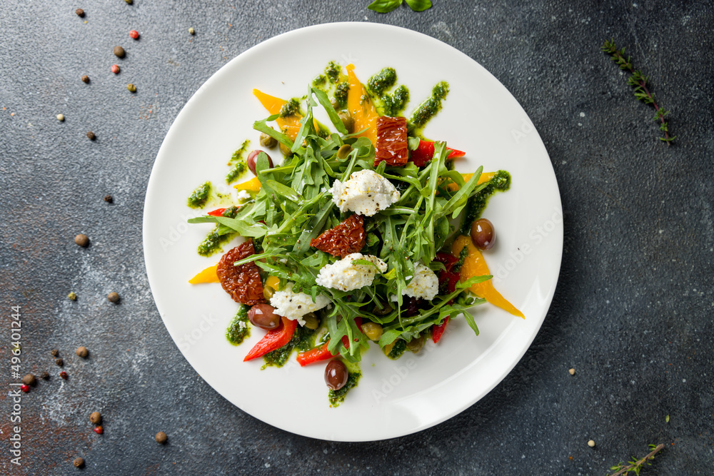Green vegetable salad with pepper, aragula, sundried tomatoes and cheese with pesto sauce on dark stone table top view