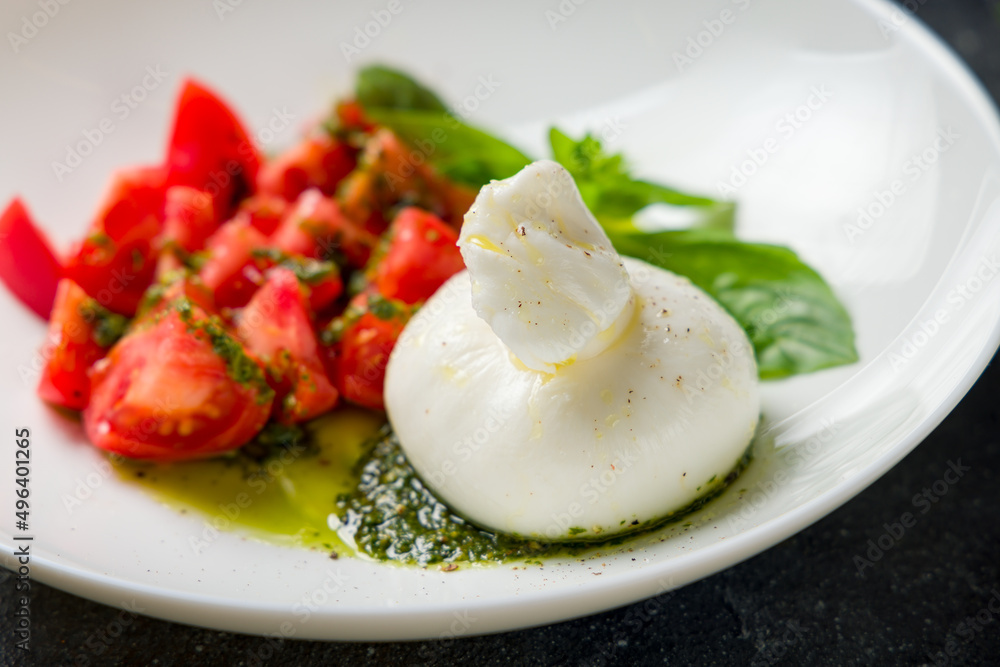 Salad with buratta cheese and tomatoes on bowl on grey table macro close up