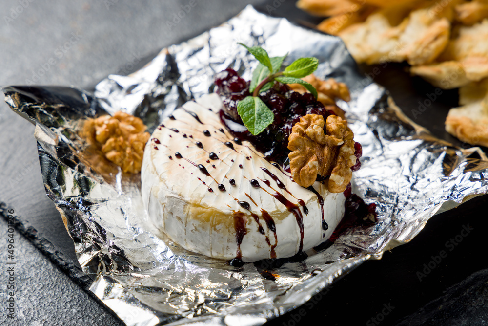 Fried Camembert with jam and croutons on dark stone table macro close up