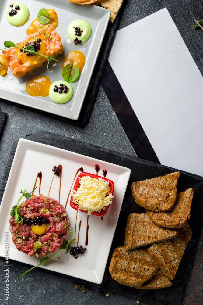 Tartare from beef and tartare from salmon on dark stone plates top view