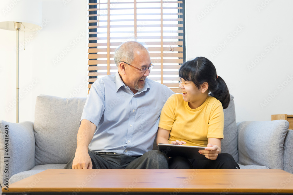 Old senior asian grandparent play and watch computer tablet with grandchildren girl at home. Bonding relationship in family.