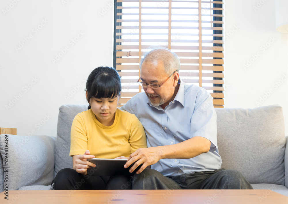Old senior asian grandparent play and watch computer tablet with grandchildren girl at home. Bonding relationship in family.