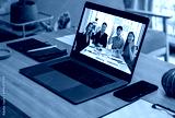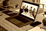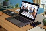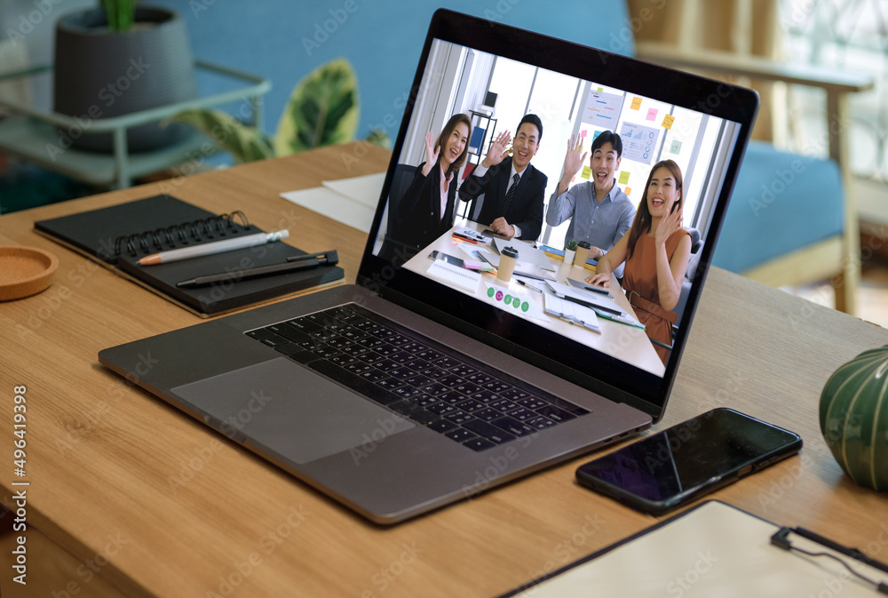 close up screen groupd of asian colleage video confernece business plan with laptop on table at home
