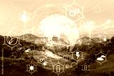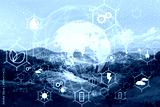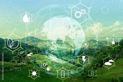 Beautiful landscape view of green mountain cloud and sky with global environmental technology concept background
