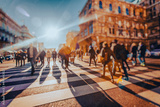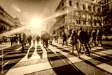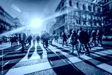 Silhouette of people walking on the street of big city shopping day, big crowd of people walking