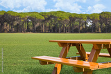 Wooden new picnic table on a green meadow of a public park with trees on background and cloudy sky - image with copy space
