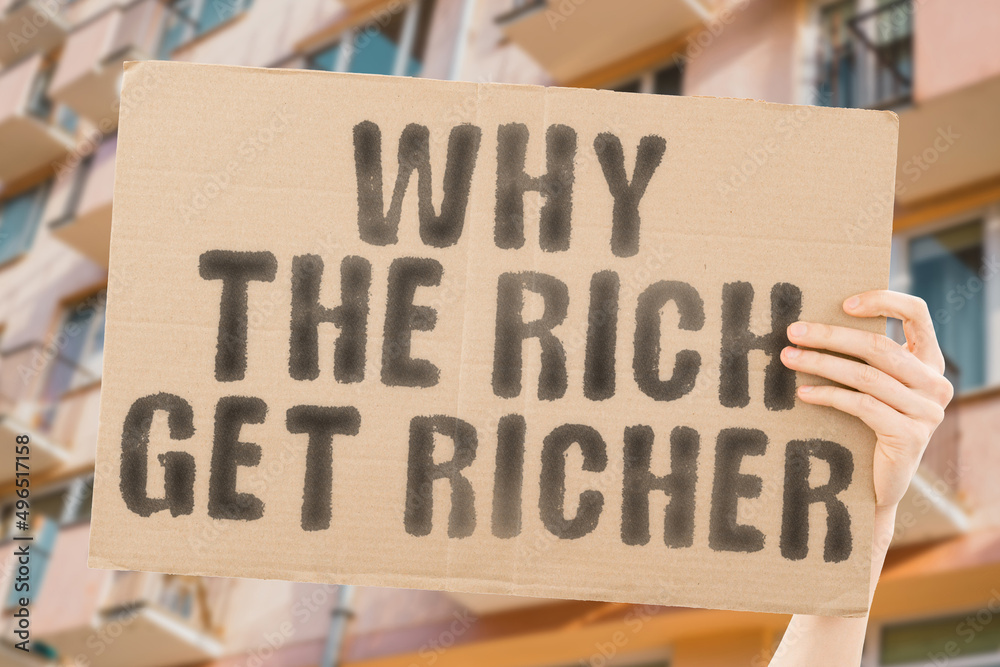 The phrase " Why the rich get richer " on a banner in men's hands with blurred background. Apparel. Bond. Career. Cash. Data. Corporate. Contest. Company. Commerce. Chart. Advice. Winning. Prize