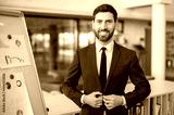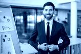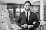 Portrait of a highly qualified successful Caucasian businessman, strategy consultant, risk manager, analyst, standing near whiteboard with charts, in modern office, in formal suit, smiles friendly