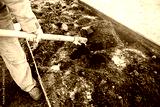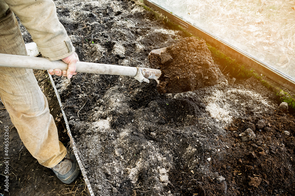 Male gardener worker digging in vegetable garden with shovel. Farmer man in rubber boots working hands with spade dig black soil, ground, lawn.farmland, agriculture. Autumn fall spring work cleaning