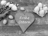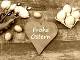 Osterkarte: Herz mit dem Schriftzug Frohe Ostern auf altem Holz mit Osterdekoration.