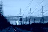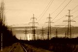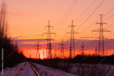 The towers of electric main in the countryside near old railway on the background red, orange and yellow sunset or sunrise sky