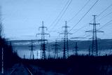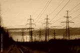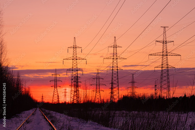 The towers of electric main in the countryside near old railway on the background red, orange and yellow sunset or sunrise sky
