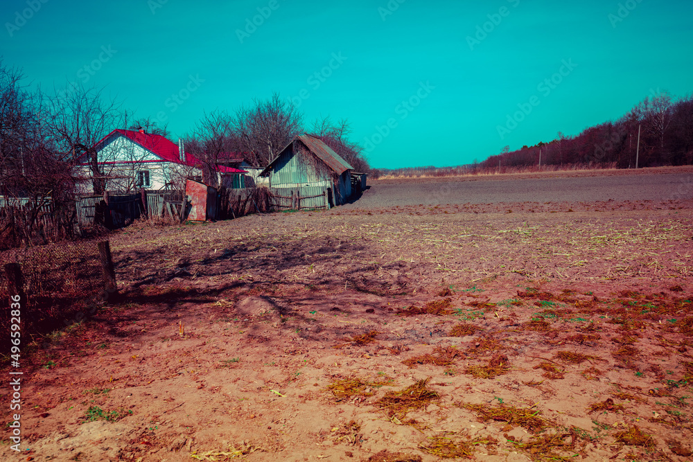 View of the countryside in early spring. View of cultivated land near the village