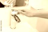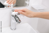 Cleaning the sink faucet with a microfiber cloth. Sanitize surfaces prevention in hospital and public spaces against corona virus. Woman hand using wet wipe. Cleaning the bathroom.