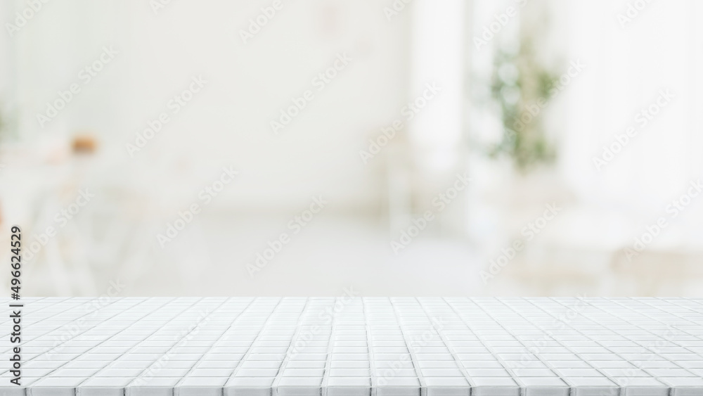 Empty white ceramic mosaic table top and blurred bokeh cafe and restaurant background with vintage filter - can used for display or montage your products.