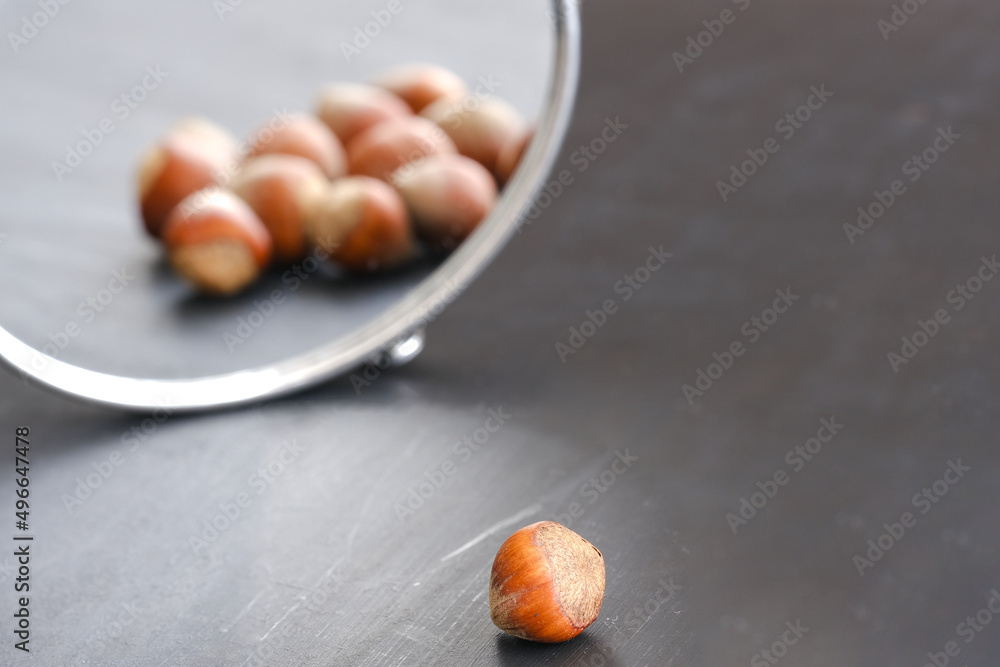 A hazelnut looking itself in the mirror, seeing his reflection more crowded and positive. Metaphoric or analogical expression of self motivation, teamwork and leadership concept idea.