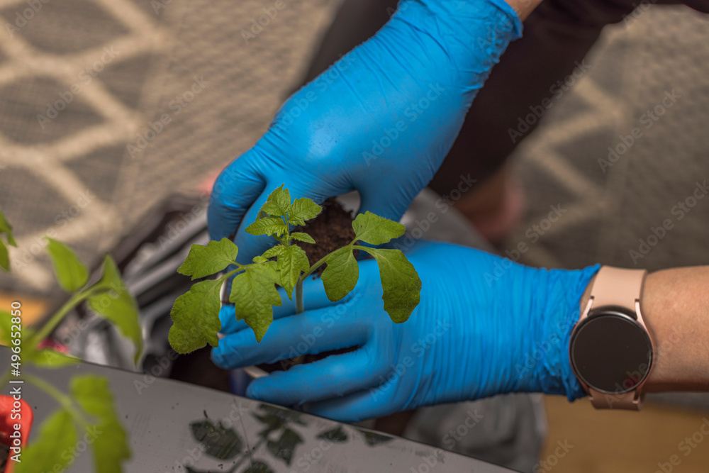 Close up view of hands in gloves taking care of growing seedlings tomato plants. Sweden.