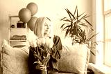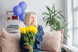 Happy adult woman hold bouquet of flowers at home
