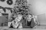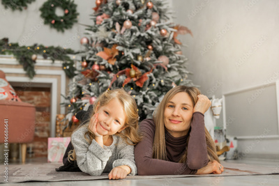 beautiful mother and daughter lie near the Christmas tree