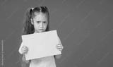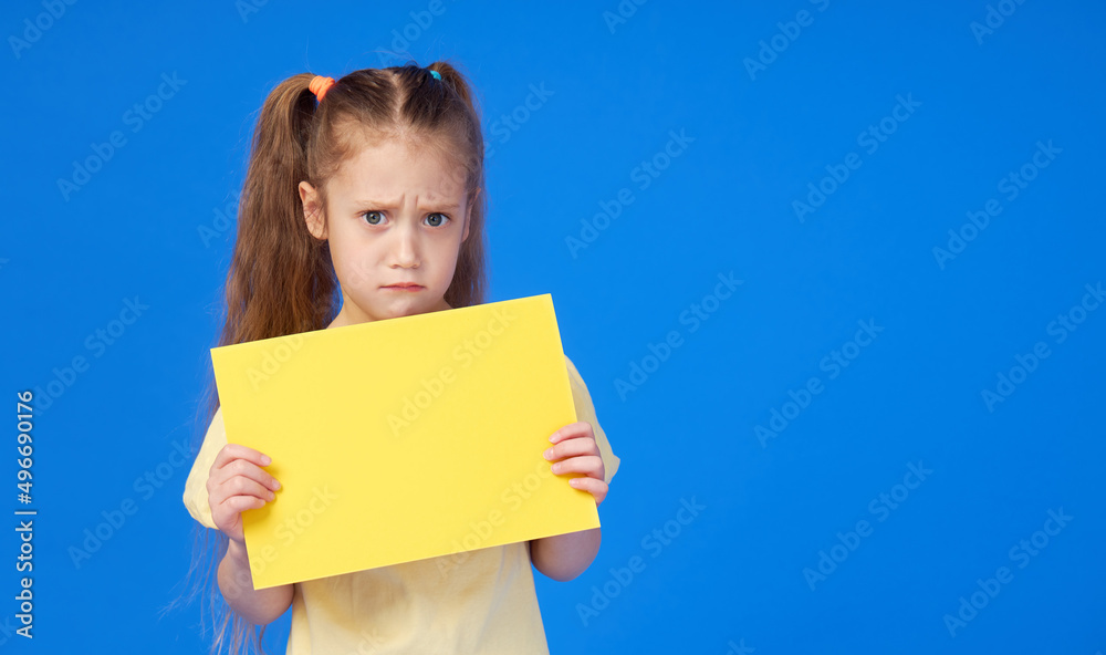 A sad little girl is holding a yellow sign for an inscription on a blue background. Funny face.