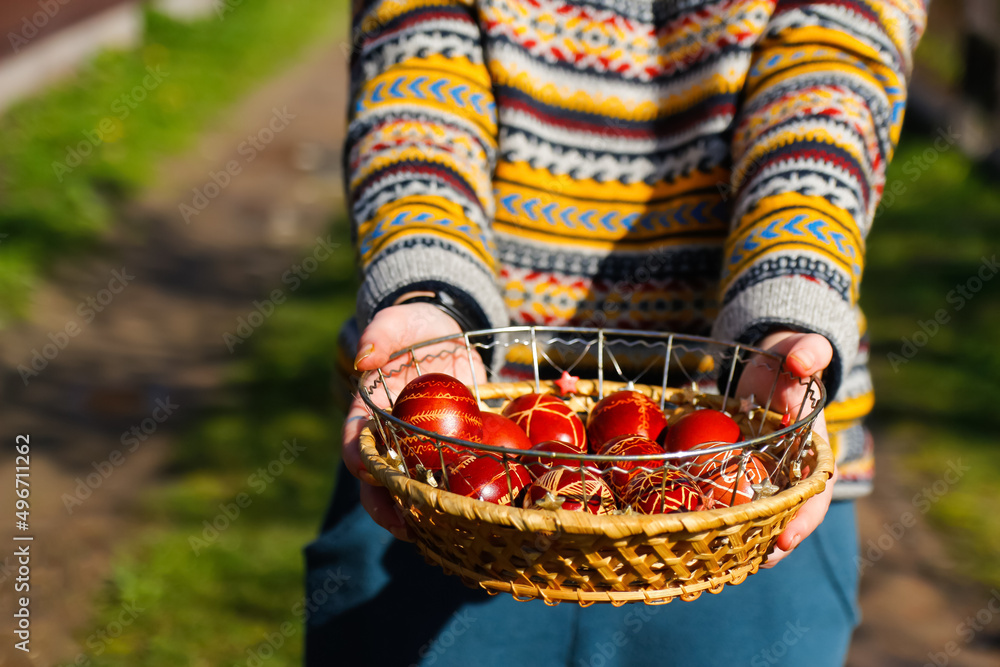 Defocus ukrainian young smiling woman in hat holding plate of collection of red egg on nature background. Easter, Ukraine. Craft painted eggs. Pysanka or krashanka. Closeup. Out of focus