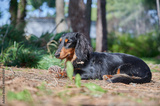 Black long hair dachshund dog laying outdoors on a sunny day. Smooth and bright hair.