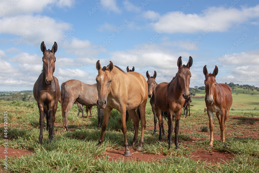 Group of Mangalarga Marchador horses and mares loose in the green pasture. Mares and foals on the farm loose.
