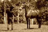 Wonderful bay mare of the Mangalarga Marchador breed with her trainer. Animal training and taming concept.