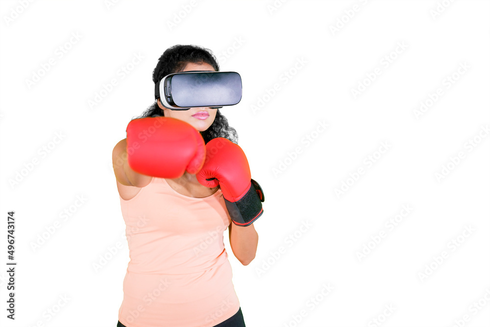 Woman wears VR glasses while doing boxing workout