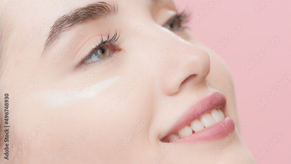 Extreme close-up of young beautiful fit Caucasian skin care woman with cream smear under her eye smiling wide against pink background | Face cream commercial concept