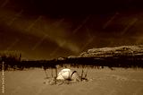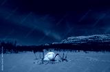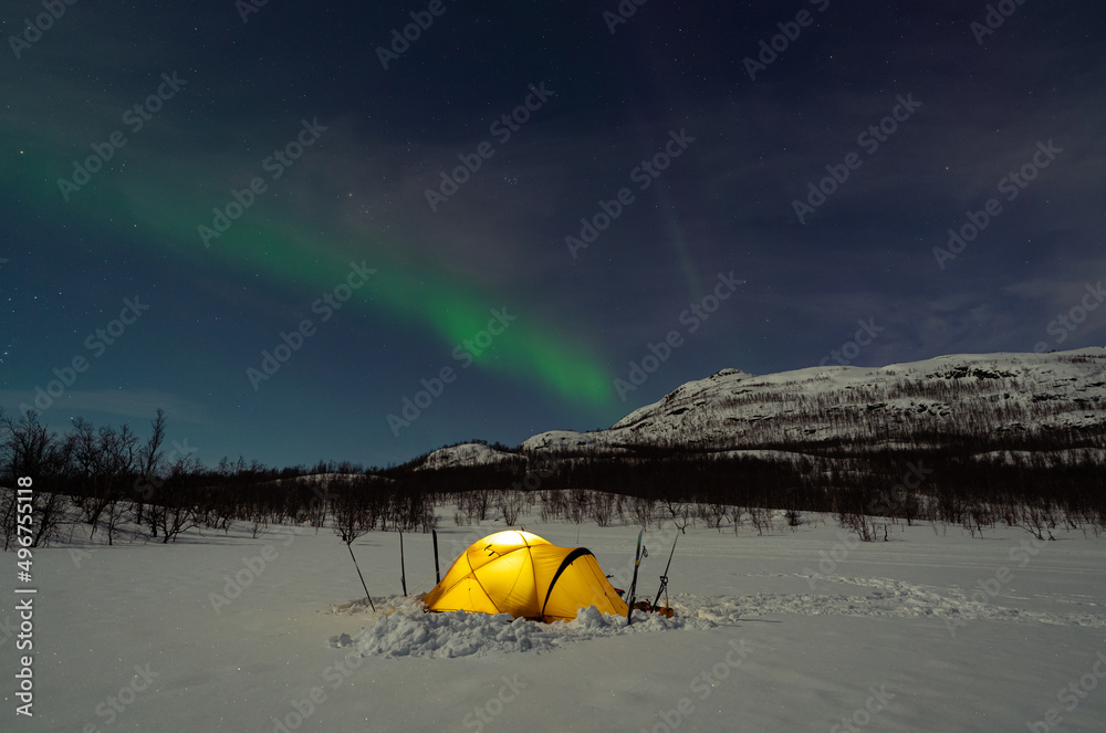 Nothern lights, aurora borealis, above a tent in Swedish Lapland at the famous Kungsleden.