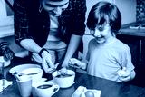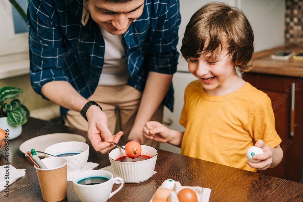 Easter day. Male Father and son painting eggs on wooden background. Family sitting in a kitchen. Preparing for Easter, creative homemade decoration. Child kid boy having fun and painting easter eggs