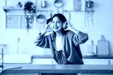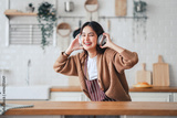 Happy carefree asian woman wearing headphones have fun moving listening to music relax in kitchen, She dance enjoy leisure weekend at home.