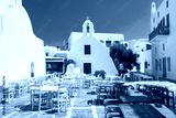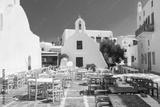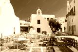 Famous old town narrow street with cafe and chapel. Mykonos island, Greece