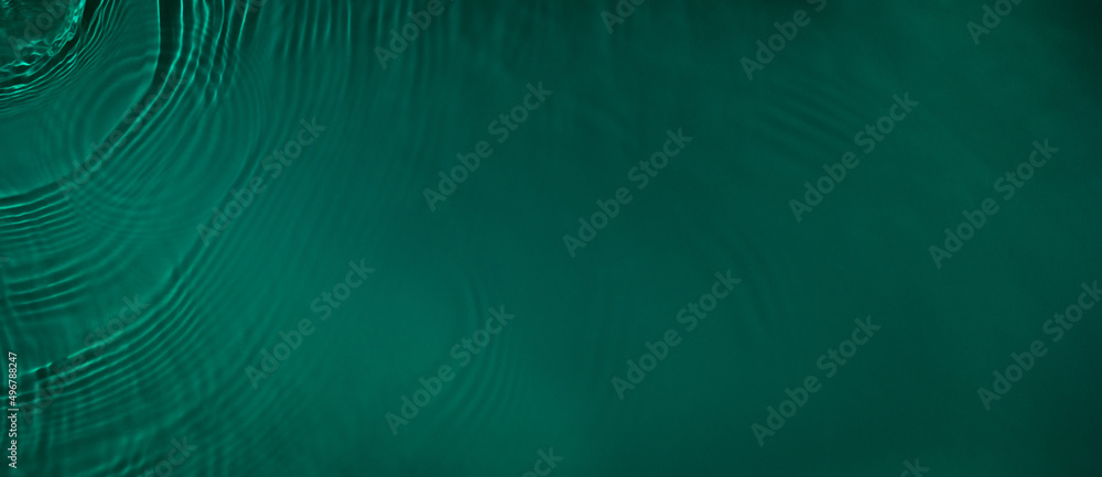 Transparent dark green clear water surface texture with ripples and splashes. Abstract summer banner background Water waves in sunlight with copy space Cosmetic moisturizer micellar toner emulsion