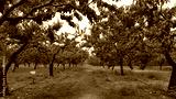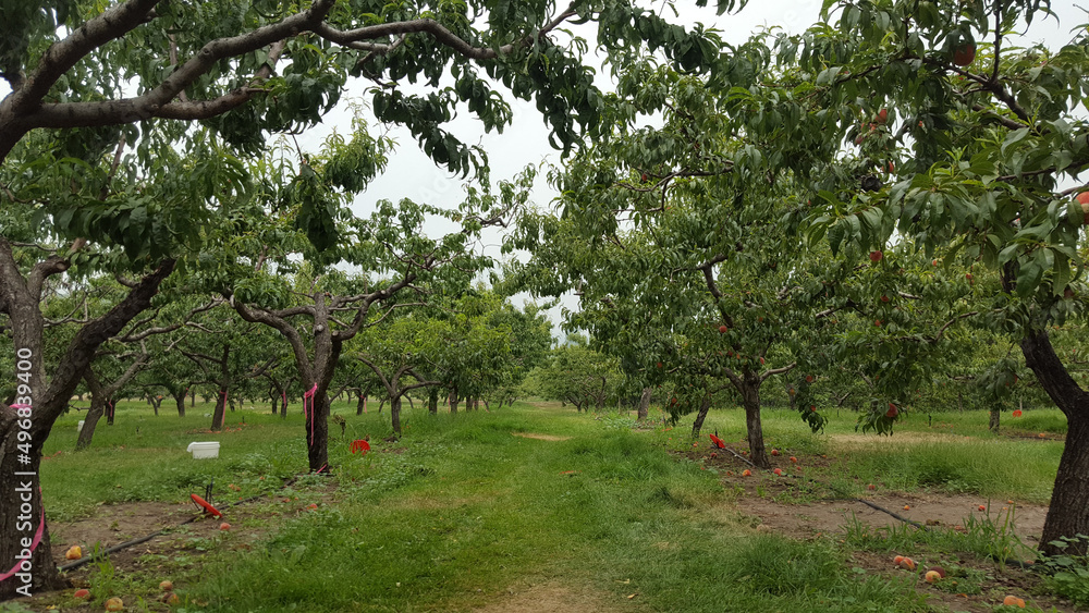 Natural view of a pathway with peach trees on the side in Okanagan Valley, Canada