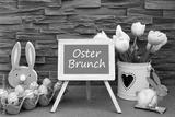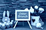 Osterdekoration und eine Kreidetafel mit dem Text Oster Brunch.