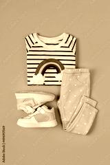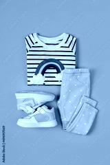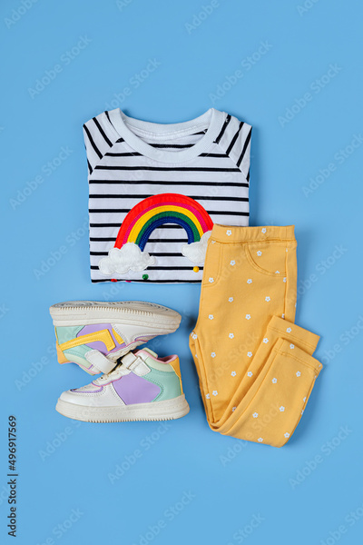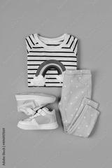 Set of kids clothes and accessories. Childrens jumper with trousers and sneakers. Fashion Baby outfit for spring, autumn or summer.