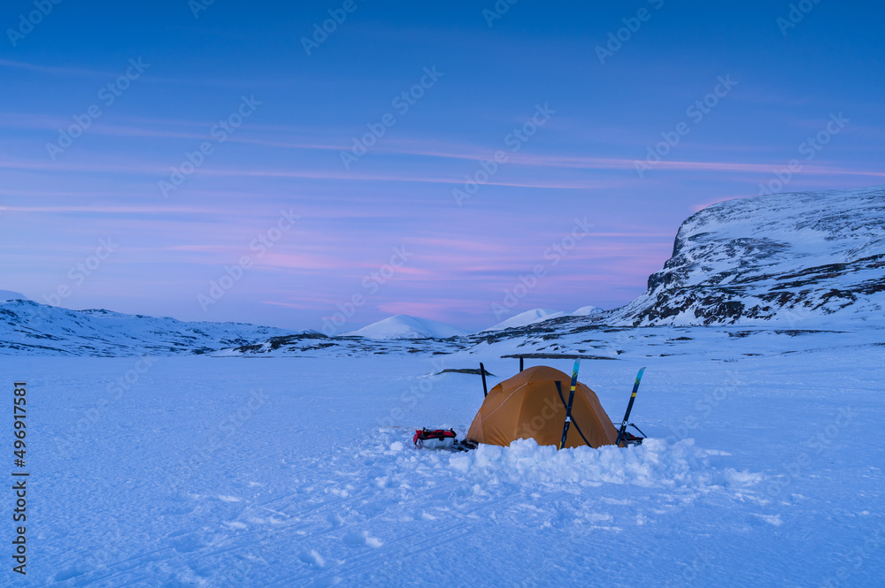 Tent just after sunset during a winter trekking in the mountains of Lapland.