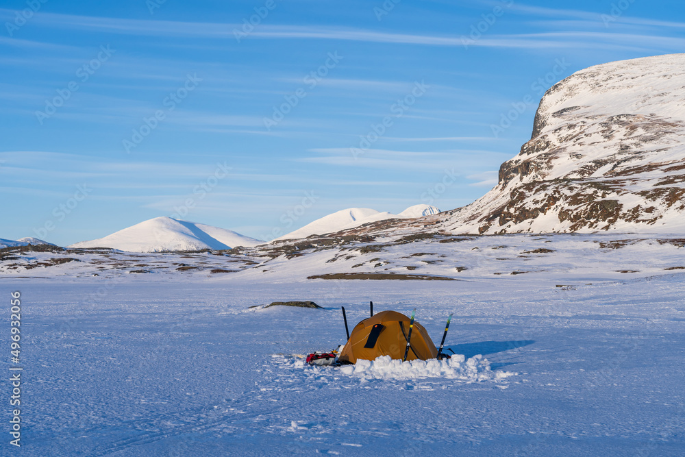 A tent pitched in the snow during a winter trekking in the mountains of Lapland.