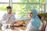 Muslim family having breakfast together. Celebration of Eid al-Fitr
