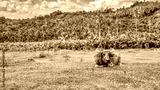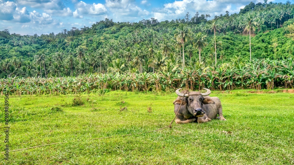 An adult carabao (Bubalus bubalis), a type of water buffalo native to the Philippines, relaxes on grass after a day of agricultural work, with banana plants and coconut palm trees in the background.