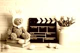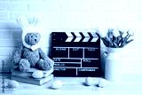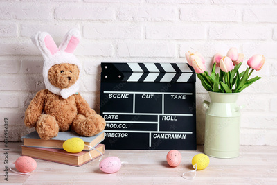 Movie clapper board with Easter decorations against a white brick wall. Cinema for the spring holidays.