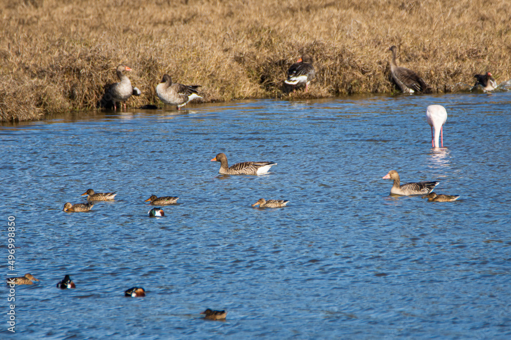 Flamingo, phoenicopterus ruber, in national Park Donana, Andalusia, Spain.