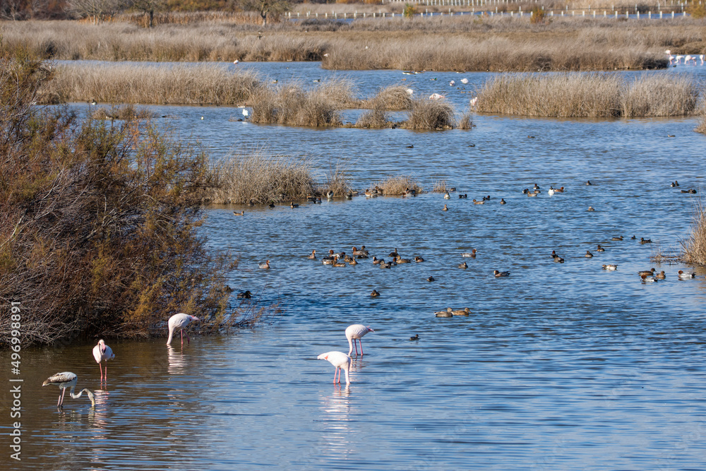 Flamingo, phoenicopterus ruber, in national Park Donana, Andalusia, Spain.