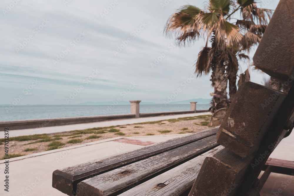Empty bench on seaside or coast, beautiful sea, sky and palm tree view from empty wooden bench.