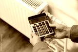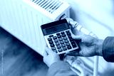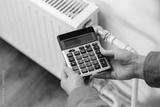 heating, energy crisis and consumption concept - close up of hand with calculator and radiator at home